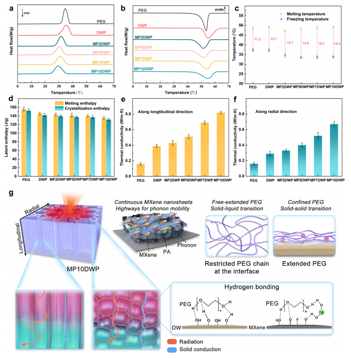 圖5(a)MXene/植酸修飾木材(MPDWP)在冷卻過程中的DSC曲線;(b)加熱過程中的DSC曲線;(c)純PEG、脫木質素木材(DWP)及不同MXene/植酸復合木材(MPDWP)的過冷度對比;(d)MPDWP的焓值;(e)縱向熱導率與(f)徑向熱導率(純PEG、DWP及MPDWP的對比);(g)MP10DWP中熱導率增強的潛在機理(MXene網絡促進熱傳導)及相變過程中PEG鏈運動與分子相互作用示意圖