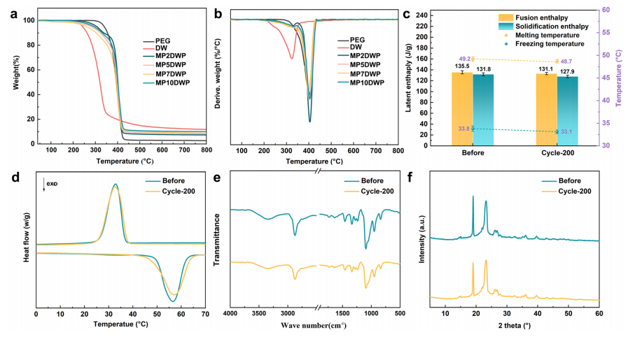 (c)200次循環后焓值僅下降2.3%(158 J/g→154.5 J/g),證明MP10DWP的相變儲能性能高度穩定;
