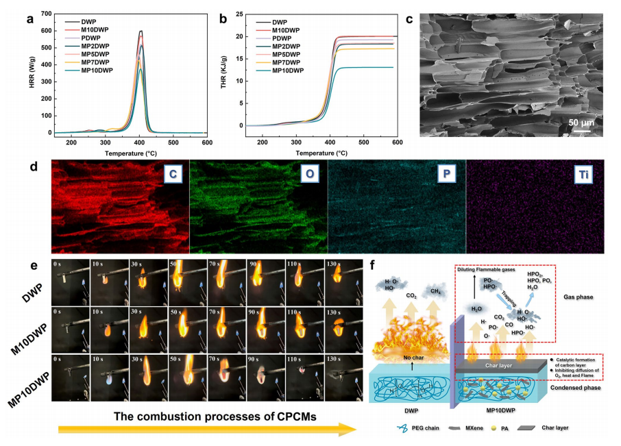 圖7(a)脫木質素木材(DW)、聚乙二醇(PEG)及MXene/植酸復合修飾木材(MPDWP)的熱釋放速率(HRR)曲線;(b)總熱釋放量(THR)對比;(c)MP10DWP燃燒后炭殘留物的掃描電子顯微鏡(SEM)圖像;(d)炭殘留物的能譜分析元素分布(EDS mapping);(e)DWP與MPDWP在垂直燃燒測試中的實物照片;(f)MPDWP的潛在阻燃機制示意圖
