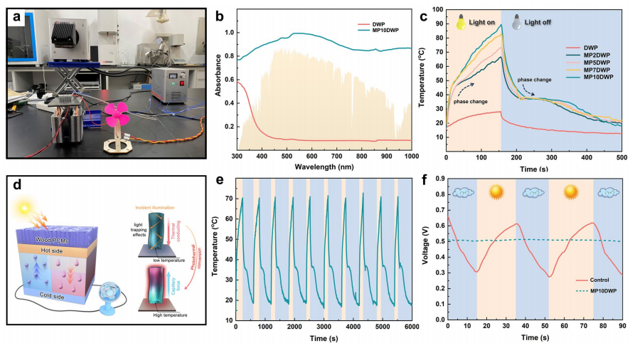 (a)集成MP10DWP的測試系統通過木材封裝相變材料實現光能吸收與熱能存儲的協同調控;