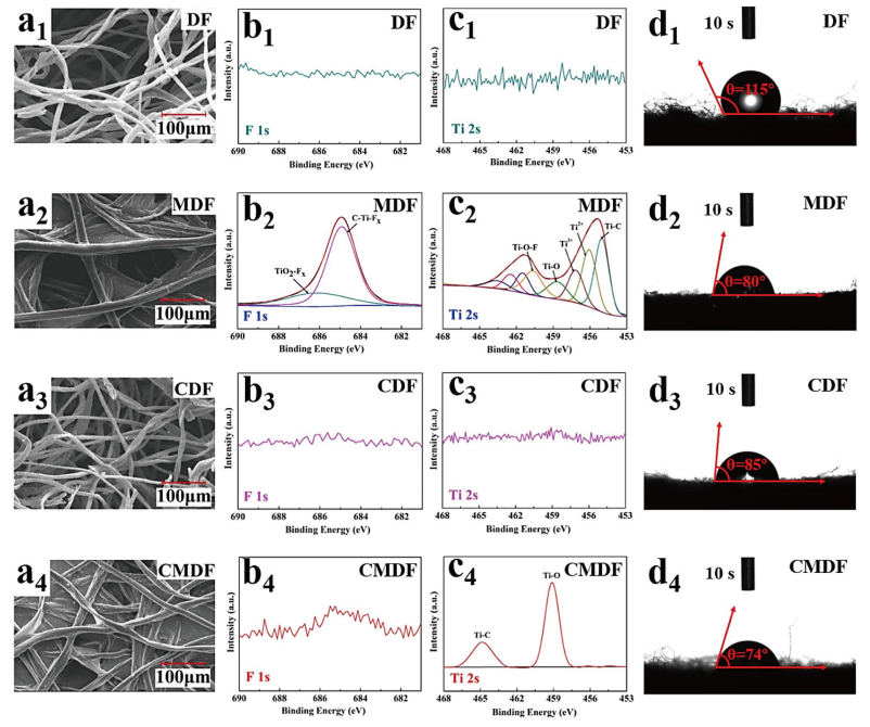 圖3. 不同樣品的SEM圖像、F 1s與Ti 2s的XPS譜圖及水接觸角對比
