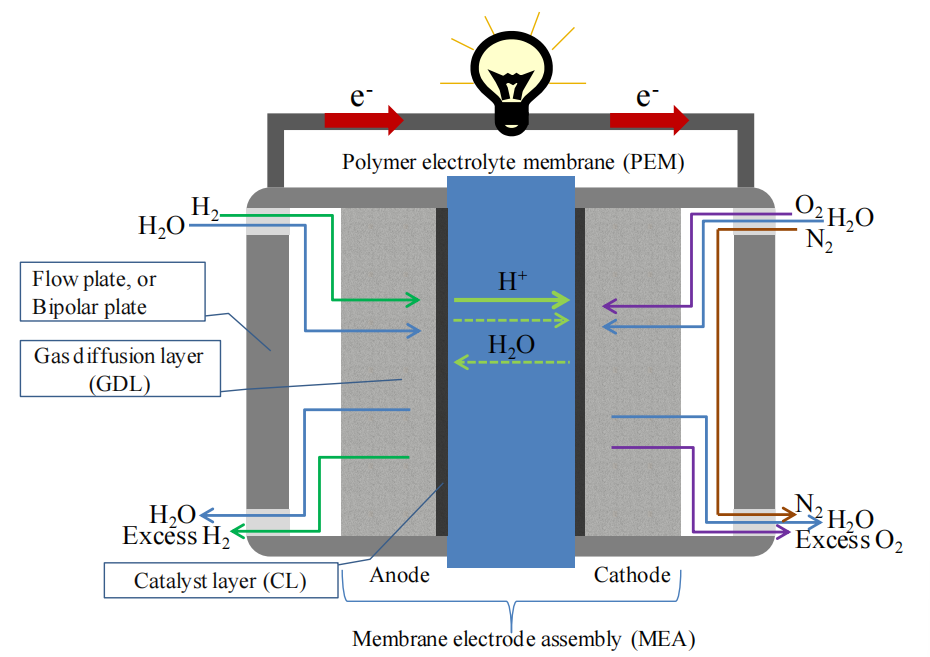 圖1.1. 氫-空氣型質(zhì)子交換膜燃料電池(PEMFC)截面結(jié)構(gòu)示意圖。