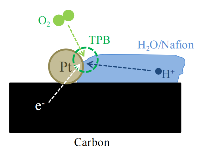 圖1.2. 質(zhì)子交換膜燃料電池(PEMFC)陰極中發(fā)生氧還原反應(yīng)(ORR,反應(yīng)1.2)的三相邊界(TPB)示意圖。