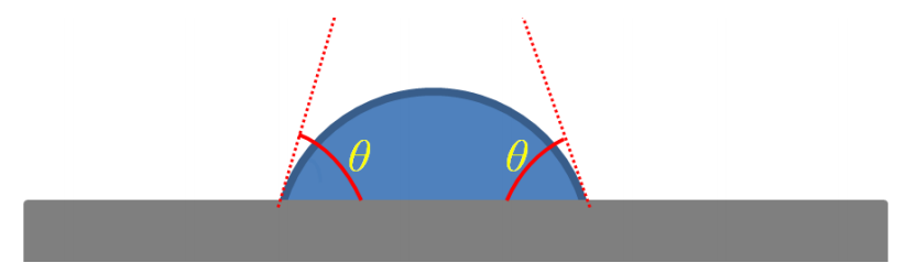 圖1.3. 水滴(藍(lán)色)在平坦樣品表面(灰色)的接觸角(θ)示意圖。