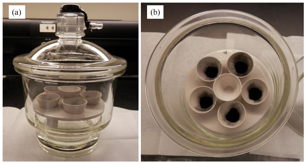 圖2.3. (a) 用于水蒸氣吸附(Water Vapor Sorption,簡稱WVS)測量的密封干燥器照片,其中碳樣品置于坩堝內(nèi);(b) 干燥器內(nèi)坩堝的俯視照片(空坩堝作為對照實(shí)驗(yàn)使用)。在將樣品放入干燥器前一天,已向密封干燥器底部加入100毫升蒸餾水。