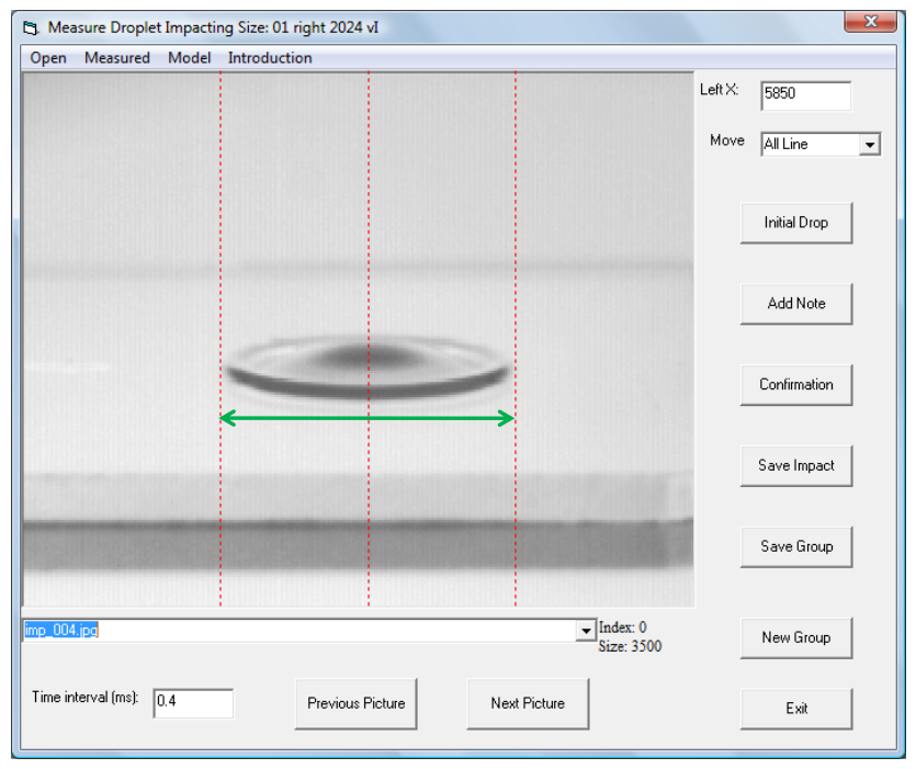 圖2.4. 用于測量液滴在樣品表面瞬時(shí)鋪展直徑(綠色箭頭)的Visual Basic軟件界面。