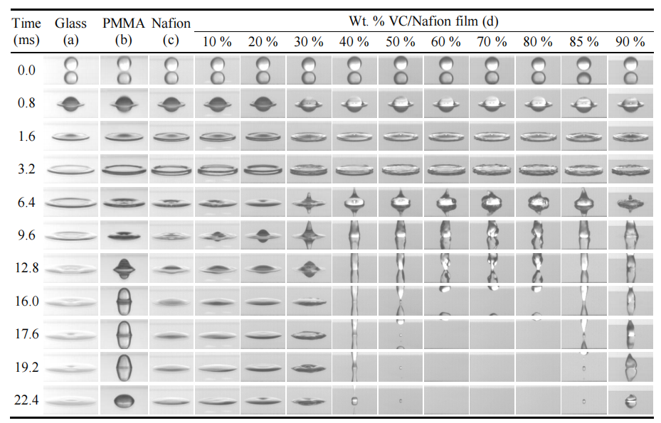圖3.1. 直徑2.4 mm水滴撞擊不同基底材料的動態(tài)序列圖像:(a) 裸玻璃;(b) 聚甲基丙烯酸甲酯(PMMA);(c) 全氟磺酸樹脂(Nafion);(d) 玻璃基體表面涂覆的10–90 wt.% 火山碳(VC)/Nafion復(fù)合薄膜(沖擊高度均為120 mm)。液滴行為的差異源于材料表面能特性差異。