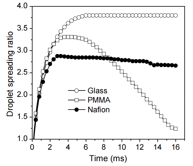 圖3.2. 水滴撞擊裸玻璃、聚甲基丙烯酸甲酯(PMMA)及全氟磺酸樹脂(Nafion)表面的實(shí)驗(yàn)鋪展率(公式3.1)