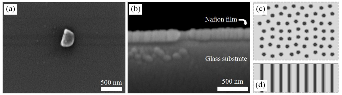 (a) 玻璃基底上旋涂1%全氟磺酸樹脂(Nafion)/異丙醇溶液制備的薄膜俯視表面Pd/Au濺鍍層SEM圖像。圖中灰色顆粒(可能為玻璃碎屑)用于輔助聚焦13;(b) 薄膜截面SEM圖像;(c) 本工作中Nafion薄膜表面結(jié)構(gòu)示意圖,深色球體代表納米通道開口;(d) 薄膜截面結(jié)構(gòu)示意圖,垂直深色條帶對應(yīng)納米通道分布。