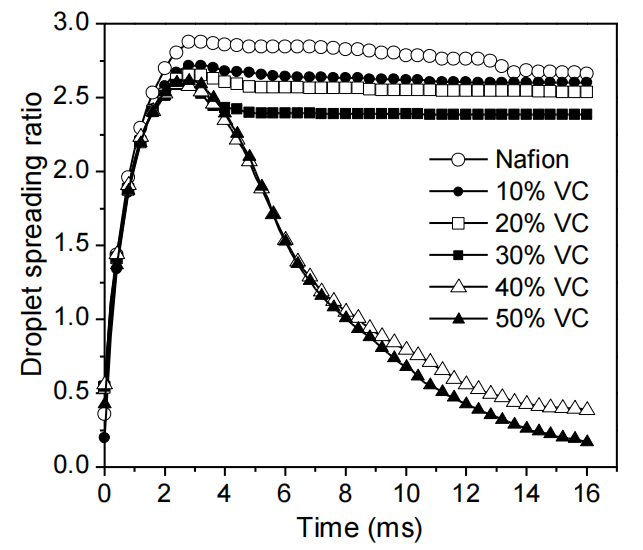 圖3.4. 水滴撞擊旋涂全氟磺酸樹脂(Nafion)薄膜及系列火山碳(VC)/Nafion復(fù)合基底表面(10–50 質(zhì)量分?jǐn)?shù))的實(shí)驗(yàn)鋪展率。