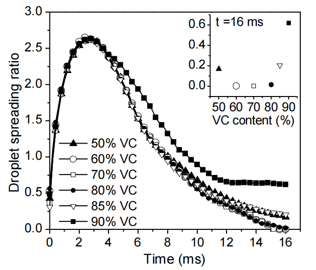 圖3.5. 水滴撞擊火山碳(VC)/全氟磺酸樹脂(Nafion)復(fù)合基底表面(50–90 質(zhì)量分?jǐn)?shù))的實(shí)驗(yàn)鋪展率。插圖為 t = 16 毫秒時(shí)刻的鋪展率數(shù)據(jù)。