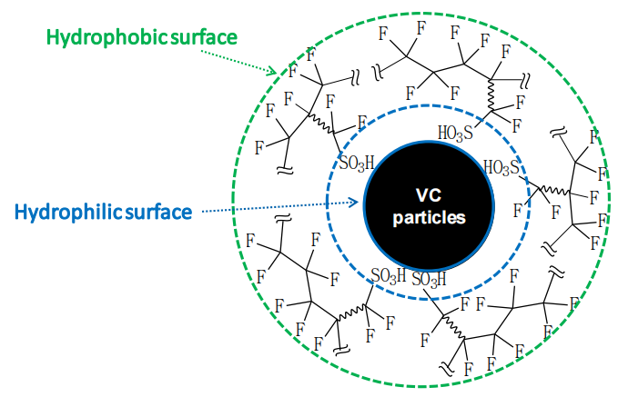 圖3.6. 全氟磺酸樹脂(Nafion)在火山碳(VC)顆粒表面的取向結(jié)構(gòu)示意圖