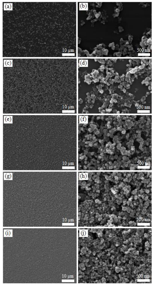 3.7. 圖3.7鈀/金濺射處理的火山碳(VC)/全氟磺酸樹脂(Nafion)復(fù)合基底表面掃描電子顯微鏡(SEM)圖像。(a–b) 20% VC/Nafion、(c–d) 40% VC/Nafion、(e–f) 60% VC/Nafion、(g–h) 80% VC/Nafion、(i–j) 90% VC/Nafion。第一列與第二列分別為低倍率與高倍率下的表面形貌。