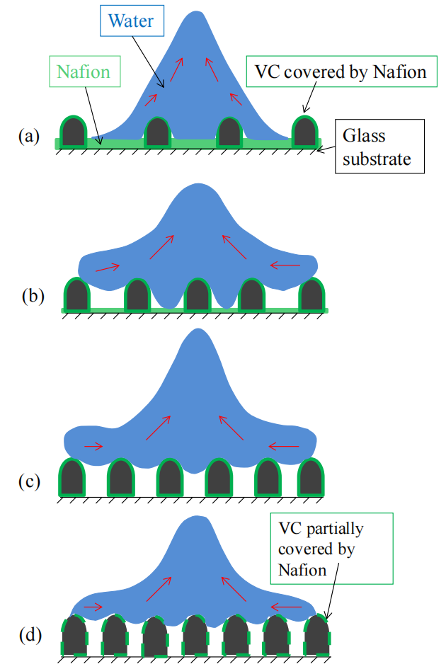 圖3.8. 水滴(藍(lán)色)撞擊不同比例火山碳(VC)/全氟磺酸樹脂(Nafion)復(fù)合材料表面后的回縮過程示意圖。(a) 30% VC/Nafion、(b) 40% VC/Nafion、(c) 60% VC/Nafion、(d) 90% VC/Nafion。圖中捕捉了水滴在 t = 6.4 毫秒時(shí)的動態(tài)(如圖3.1所示),展示了水滴與碳基/Nafion復(fù)合表面間的相互作用。紅色箭頭表示水滴的運(yùn)動方向。