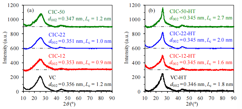 圖4.1. 碳材料樣品熱處理前后的X射線衍射(XRD)圖譜。(a) 未熱處理樣品、(b) 氮?dú)鈿夥罩?500°C熱處理(HT)后樣品。曲線下方的點(diǎn)劃虛線表示各圖譜的基線。通過對應(yīng)圖譜中2θ≈25°處的衍射峰,應(yīng)用布拉格定律計(jì)算層間距(d<sub>002</sub>),并基于謝樂方程獲得c軸方向晶粒尺寸(L<sub>c</sub>)[164]。