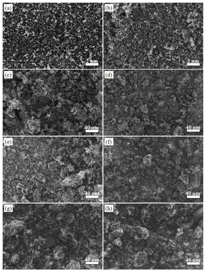 圖4.3. 不同碳材料粉末的低倍率場發(fā)射掃描電子顯微鏡(FE-SEM)圖像。(a) 火山碳(VC)、(b) VC經(jīng)熱處理(VC-HT)、(c) CIC-12、(d) CIC-12-HT、(e) CIC-22、(f) CIC-22-HT、(g) CIC-50、(h) CIC-50-HT。所有樣品均以碳導(dǎo)電膠帶為基底,于低倍率下觀測。