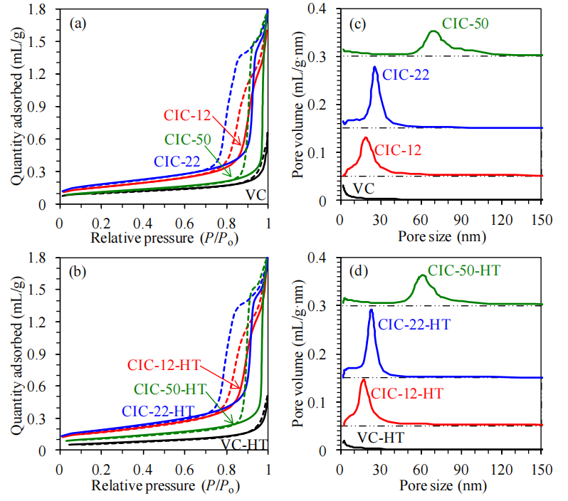 (a)吸附支、(b)脫附支數(shù)據(jù)通過Barrett-Joyner-Halenda (BJH) 方法計(jì)算,并以炭黑t-曲線為標(biāo)準(zhǔn)確定氮?dú)馕侥さ慕y(tǒng)計(jì)厚度。