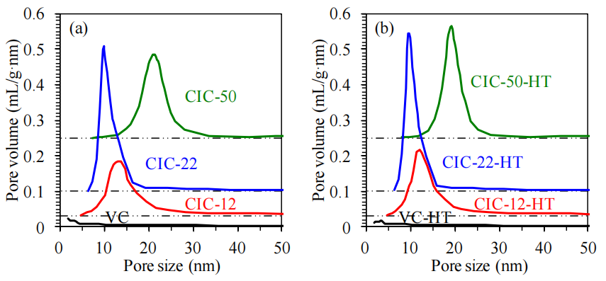 圖4.5. 熱處理前后碳材料的孔徑分布對比。(a) 未熱處理、(b) 在氮?dú)鈿夥罩杏?500°C下熱處理2小時(shí)(HT)后的碳材料孔徑分布。基于氮?dú)馕摳降葴鼐€(圖3)的‌脫附支數(shù)據(jù)‌,采用Barrett-Joyner-Halenda(BJH)方法計(jì)算,并以碳黑t曲線為標(biāo)準(zhǔn)確定吸附氮膜的統(tǒng)計(jì)厚度[172]。分布曲線下方的點(diǎn)劃虛線(dash-dot-dot lines)表示對應(yīng)圖的基線。