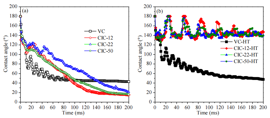 高溫處理可能通過石墨化增強(qiáng)碳骨架疏水性,導(dǎo)致接觸角增大及水滴吸收時(shí)間延長;