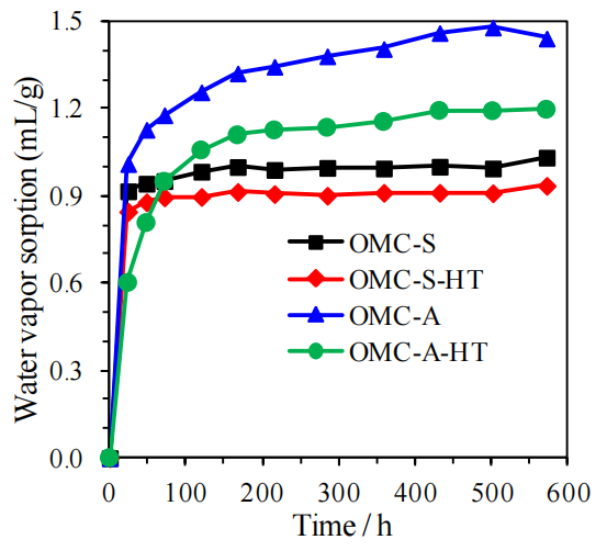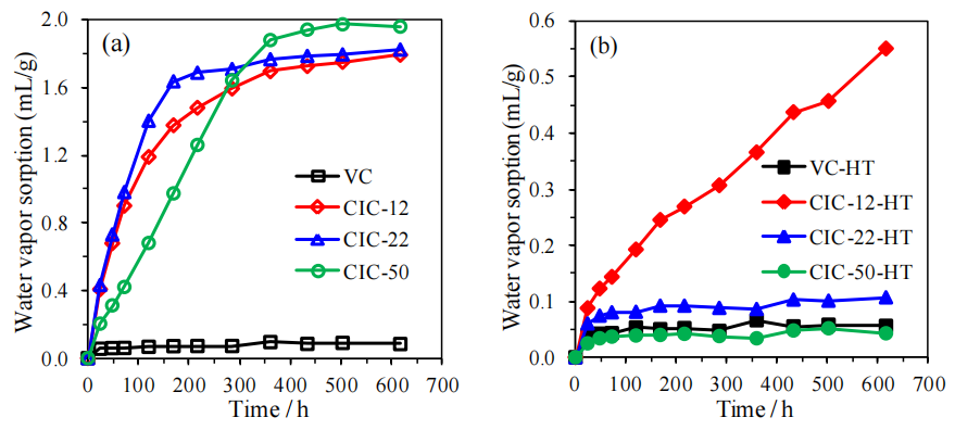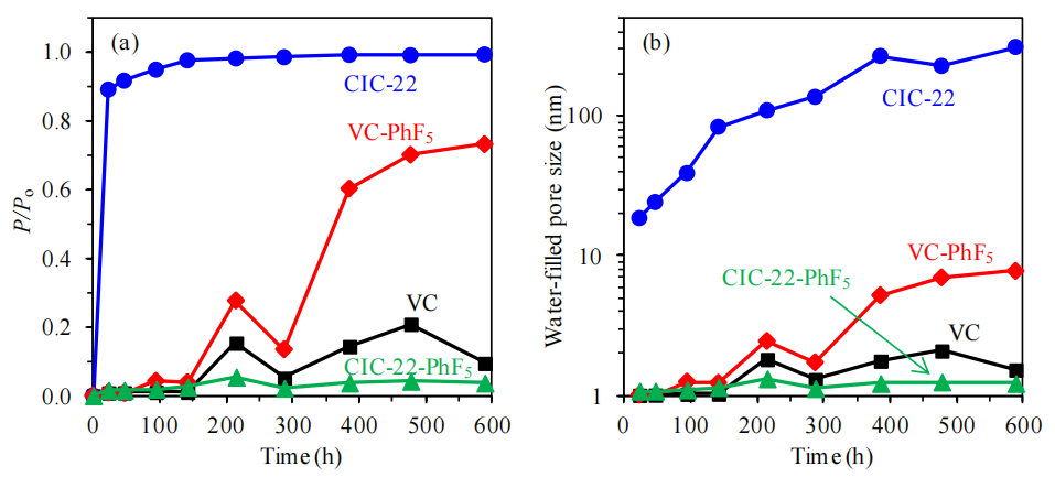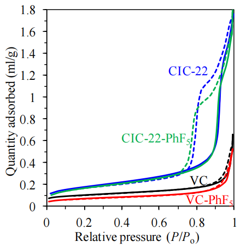 原始碳材料(如CIC-22)因表面含氧官能團(tuán)(羥基、羧基等)的親水性,可能通過氫鍵作用加速水蒸氣吸附;而功能化后,化學(xué)惰性-PhF5基團(tuán)阻礙了水分子與表面的直接接觸,吸附速率降低;