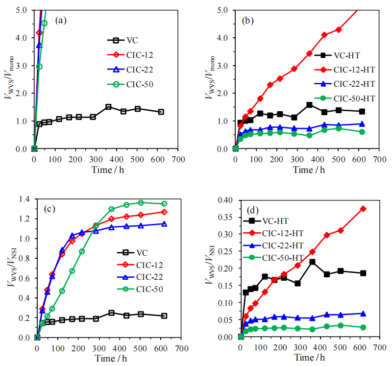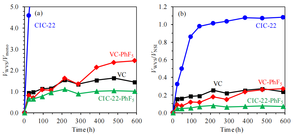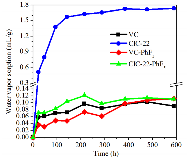 圖6.5. 五氟苯基(-PhF5)基團(tuán)表面功能化前后VC與CIC-22材料在室溫水蒸氣環(huán)境中的水蒸氣吸附(WVS)數(shù)據(jù)‌