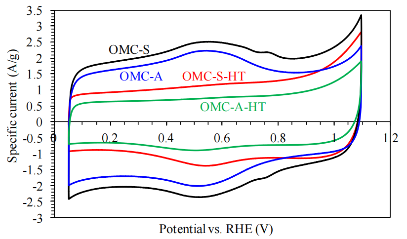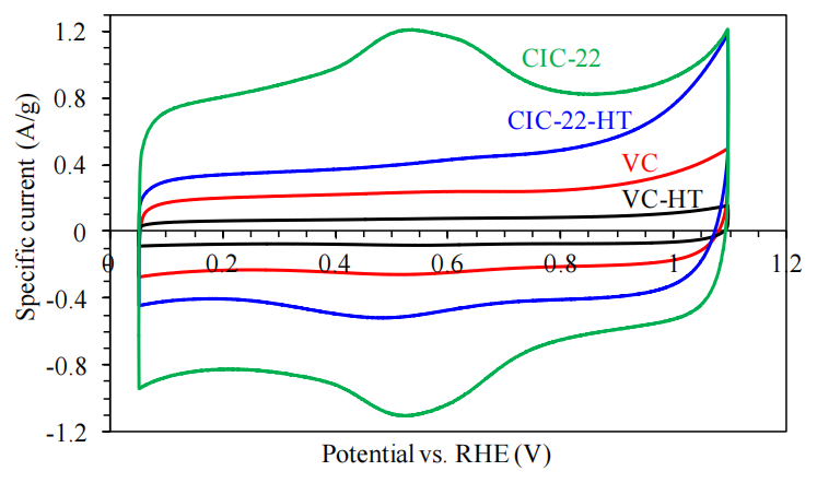 圖4.10. 不同碳材料的循環(huán)伏安(CV)性能對比。VC(未熱處理)、VC-HT(熱處理)、CIC-22(未熱處理)及CIC-22-HT(熱處理)在氮?dú)怙柡偷?.5 M H<sub>2</sub>SO<sub>4</sub>水溶液中的循環(huán)伏安曲線,掃描速率為10 mV/s。