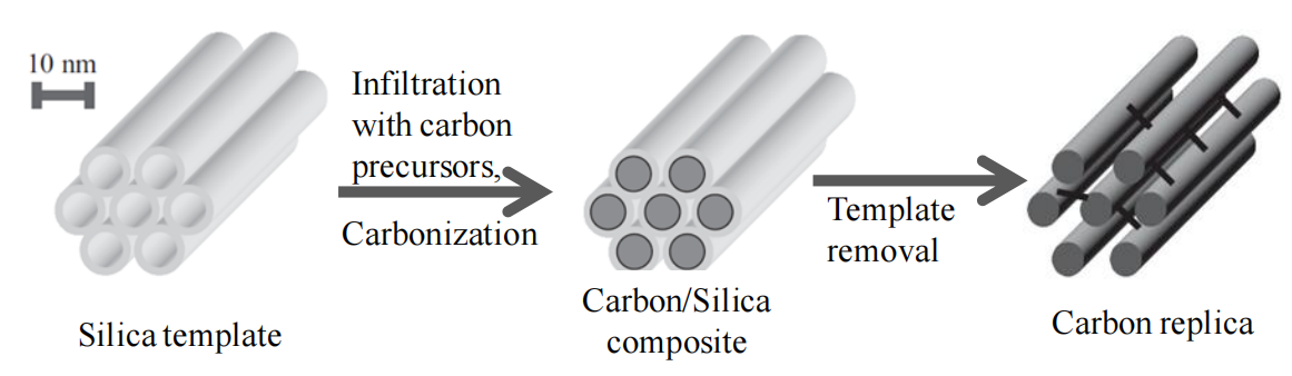 圖5.1. 以有序介孔二氧化硅為模板制備有序介孔碳(OMC)的示意圖[71]。