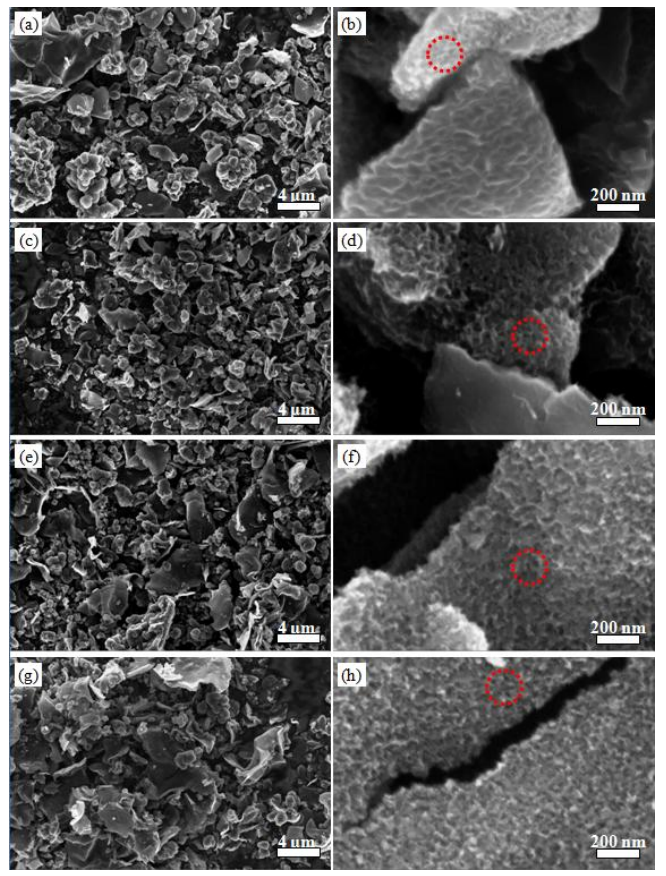 圖5.2. 負(fù)載于碳膠帶上的有序介孔碳樣品場發(fā)射掃描電子顯微鏡(SEM)圖像。(a, b) OMC-S、(c, d) OMC-S-HT、(e, f) OMC-A及(g, h) OMC-A-HT的SEM圖像,第一列為低倍率形貌,第二列為高倍率局部細(xì)節(jié)。部分孔徑≤50 nm的介孔結(jié)構(gòu)以紅色虛線標(biāo)注。