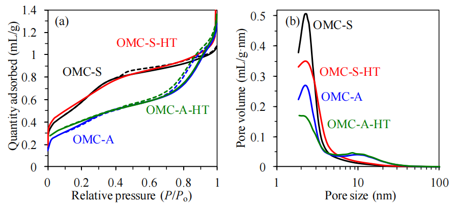 高溫氮?dú)馓幚砜赡軐?dǎo)致OMCs孔壁石墨化或孔道收縮,通過對比熱處理前后的吸附曲線可評估材料結(jié)構(gòu)的熱穩(wěn)定性;