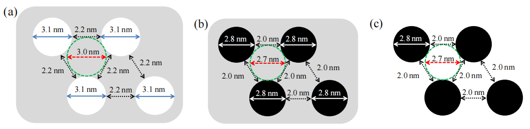 圖5.5. (a) 六方介孔二氧化硅(HMS, 灰色)模板的孔隙(白色圓)與孔壁截面尺寸示意圖‌(該模板用于合成有序介孔碳OMCs)[49, 132];‌(b) 碳前驅(qū)體填充的HMS模板(a)經(jīng)高溫(900°C)熱處理后,孔隙內(nèi)填充碳納米鏈(黑色圓)的截面尺寸示意圖‌;‌(c) 移除二氧化硅模板后(b),OMCs孔隙的截面尺寸示意圖‌。綠色虛線圓(a-c)與其外圍三個(gè)圓相切,分別表征HMS模板的二氧化硅壁厚度(a-b)或相鄰碳納米鏈之間的孔隙尺寸(c);箭頭(a-c)表示圓的直徑或兩圓邊緣之間的間隙距離。