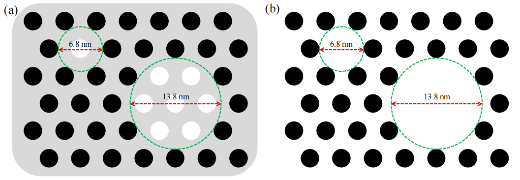 圖5.6. (a) 碳/HMS復(fù)合材料經(jīng)900°C加熱但尚未去除二氧化硅時(shí)的截面尺寸示意圖‌(黑色圓:碳納米鏈;白色圓:未填充孔隙,其尺寸與圖4b一致),‌(b) 移除二氧化硅后由碳納米鏈包圍的圓柱形孔道示意圖‌(虛線圓表征碳鏈外圍形成的孔隙)。