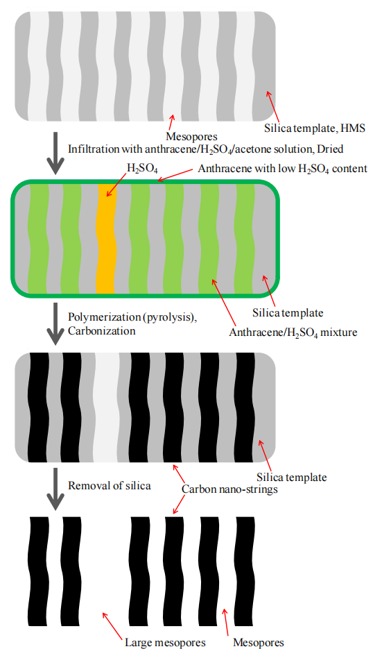 示意圖假設(shè)OMC-A的介孔結(jié)構(gòu)形成可能涉及蒽基前驅(qū)體的自組裝、模板導(dǎo)向碳化及孔道調(diào)控過程,具體路徑可能包含液相浸漬、高溫交聯(lián)與模板刻蝕等關(guān)鍵步驟;