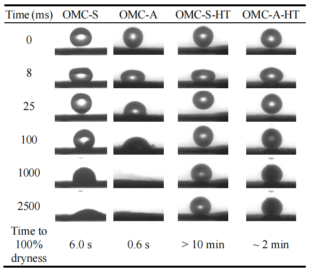 圖5.8. 壓片成型的OMC顆粒表面水滴(直徑≈2.7 mm)接觸角動力學(xué)(CAK)行為對比圖‌(氮?dú)夥諊?500°C熱處理前后)。標(biāo)注的“完全干燥時(shí)間”指顆粒吸收表面水滴至完全干燥所需時(shí)長。
