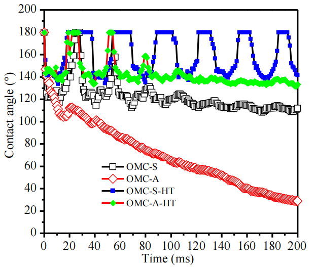 熱處理前后接觸角動態(tài)變化(如接觸角滯后)可關(guān)聯(lián)OMCs表面官能團(tuán)演化與介孔連通性差異;