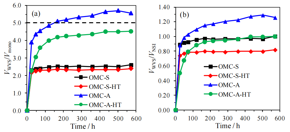 ‌圖4.8. 熱處理前后碳材料的水蒸氣吸附(VWVS)對比。(a) 未熱處理、(b) 在氮?dú)鈿夥罩杏?500°C下熱處理后的碳材料在室溫下的水蒸氣吸附性能。