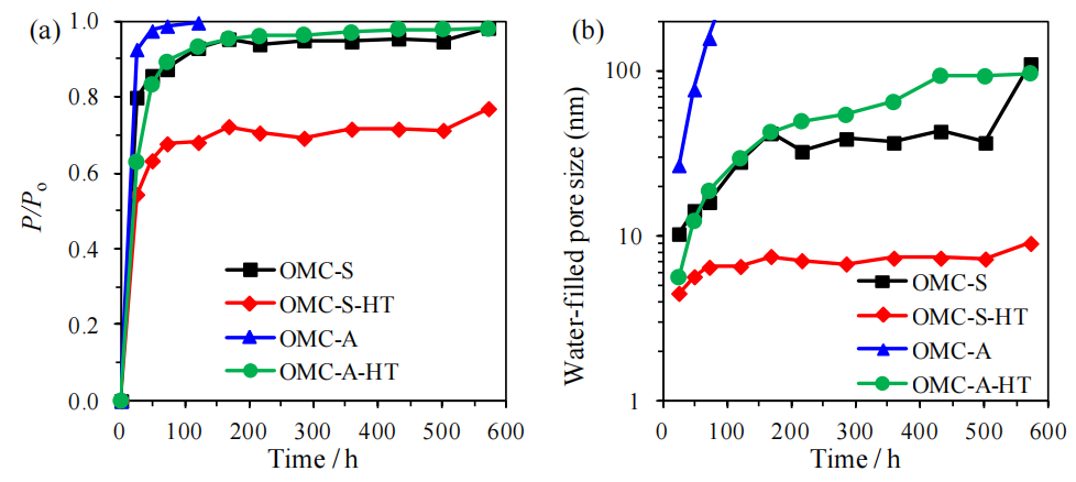 圖6.7. (a) 填充與水蒸氣吸附(圖6.5)各階段相同孔體積所需的氮?dú)猓▓D6.1)冷凝相對壓力(P/Po);(b) 根據(jù)(a)中對應(yīng)的相對壓力值,通過開爾文方程(公式5.2)及炭黑表面吸附氮?dú)饽さ慕y(tǒng)計(jì)厚度(公式5.3)[172]計(jì)算得出的隨時(shí)間推移被水填充的孔隙尺寸估計(jì)值(對應(yīng)圖6.5中各時(shí)間點(diǎn)),具體方法詳見第5章描述。‌