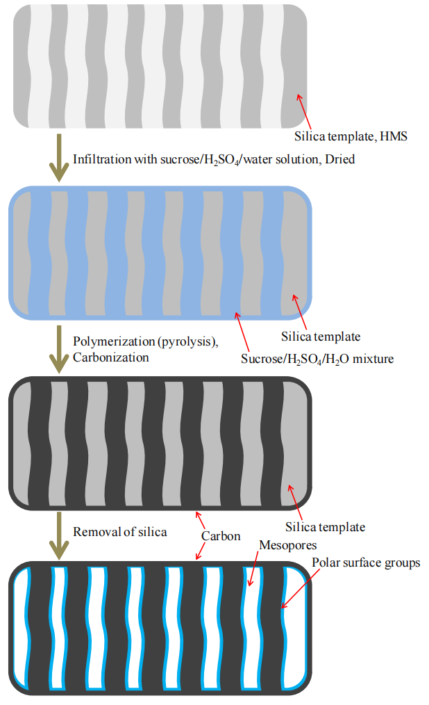 HMS的六方有序介孔結(jié)構(gòu)通過浸漬碳前驅(qū)體并高溫碳化,最終刻蝕模板獲得反向復(fù)刻的OMCs孔道;