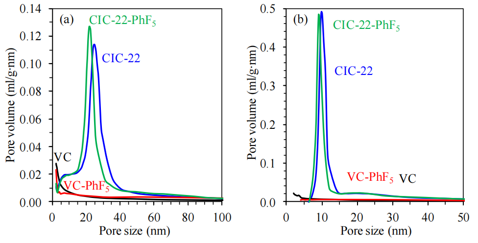 ‌微孔減少‌:-PhF5基團(tuán)接枝可能覆蓋部分微孔表面(如功能化后<2 nm孔隙占比下降),導(dǎo)致有效孔徑分布向介孔偏移;