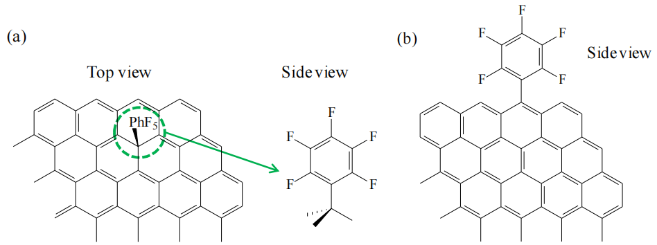 ‌平面石墨烯‌(圖a):C-C單鍵可能通過芳環(huán)平面上的sp²碳與-PhF5基團(tuán)形成定向共價(jià)連接,受表面π電子云分布影響;