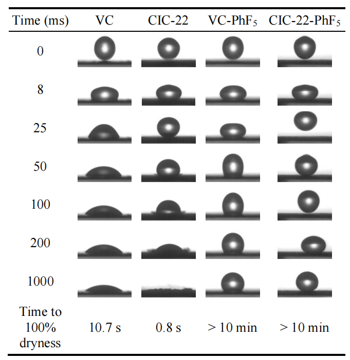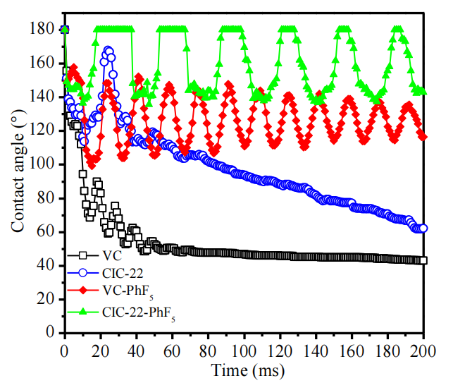 接觸角為180°表示水滴已從樣品表面完全反彈(例如圖6.3中CIC-22-PhF5樣品在t=25 ms時(shí)的狀態(tài))。