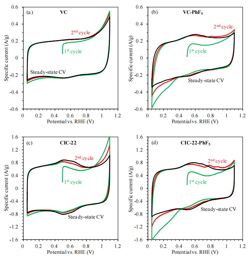 ‌圖6.8. VC、VC-PhF5、CIC-22及CIC-22-PhF5材料在氮?dú)怙柡偷?.5 M H?SO?溶液中(掃描速率10 mV/s)的循環(huán)伏安曲線(CVs)‌
