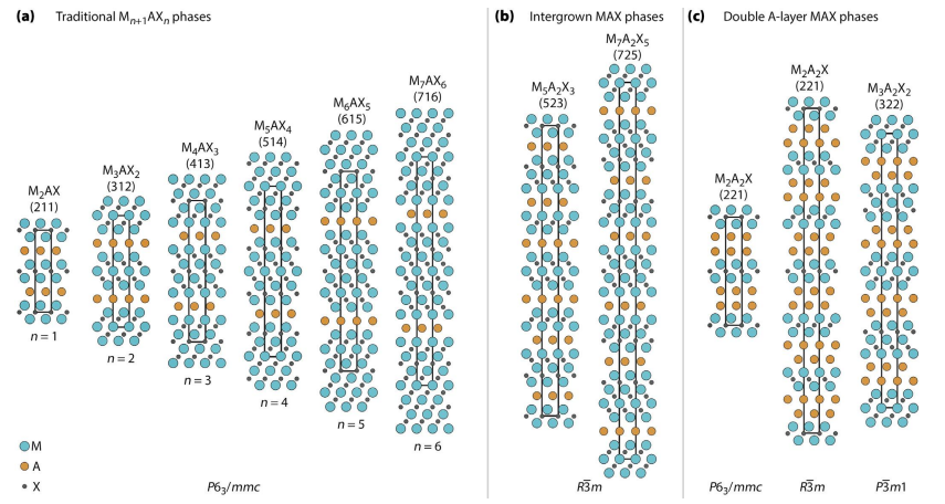 圖1 各種三元MAX相晶體結構。(a) 具有一般M_n+1AX_n組成的傳統相在P6_3/mmc空間群中結晶,(b) 具有交替厚度M_n+1X_n層的混合MAX相在R-3m空間群中結晶,以及(c) 具有雙層A層的相在P6_3/mmc、R-3m或P-3m1空間群對稱中結晶。圖中,M元素為藍色,A為橙色,X為深灰色。每個相的簡短表示法在給定的括號中。每個結構的晶胞由黑色矩形表示。