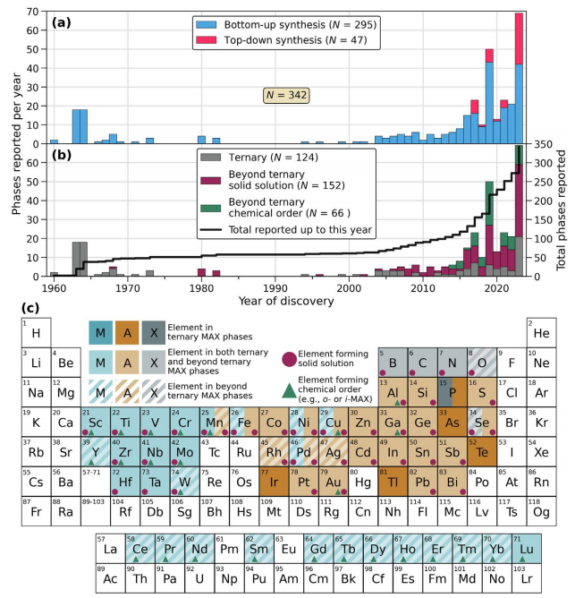圖2 合成MAX相的歷史概述。 (a) 根據合成途徑(自下而上或自上而下)和每個相中的元素數量(三個或更多)對合成的MAX相進行分類的發現直方圖。在(b)中,還通過灰色線和右側的y軸顯示了報告的MAX相的總數。 (c) 周期表顯示MAX相中包含的元素,其中M為藍色,A為橙色,X為灰色。在三元MAX相中發現的元素顏色較深,而在三元及三元以上相中發現的元素顏色較淺。條紋顏色標記在三元以上相中發現的元素。在M位、A位或X位形成固溶體或化學有序的元素分別用紫色圓圈或深藍色三角形標記。