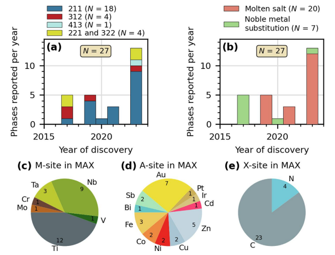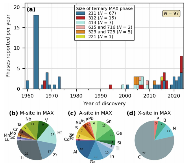 圖3 三元MAX相自下而上合成的統計數據。a) 根據階數對97個報道的三元MAX相進行分組后的發現直方圖。餅圖顯示了三元MAX相中特定元素在(b) M位,(c) A位和(d) X位的出現情況。
