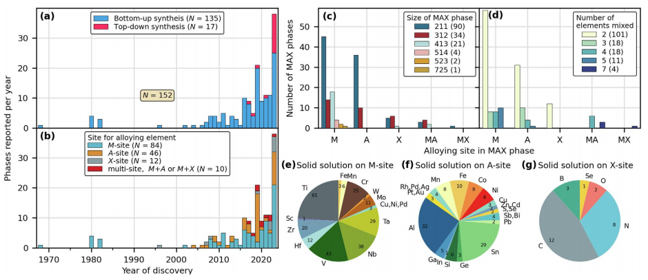 圖4 合成固溶體MAX相的統計數據。根據(a)自下而上或自上而下的合成路線以及(b)在哪個位點存在元素混合對合成相進行分類的發現直方圖。位點依賴統計量,包括(c)有序性和(d)固溶體中合金元素的數量。餅圖顯示特定元素在(d)M位、(e)A位和(f)X位上的相應出現情況。在(d)和(e)中,由于報道的出現次數較少,一些元素被分組在一起。