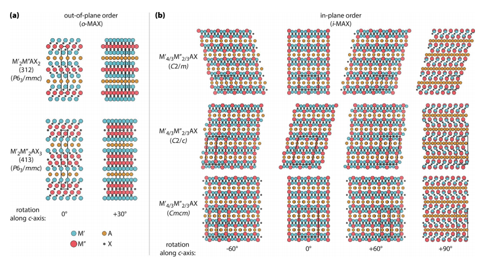 圖5 化學有序MAX相晶體結構。 (a) 平面外有序的312和413 o-MAX相,具有P63/mmc空間群對稱性。 (b) 平面內有序的i-MAX相在三種不同的空間群表示中,分別為C2/m、C2/c和Cmcm,取決于堆疊順序。列出的角度是指沿c軸旋轉以展示不同i-MAX空間組之間的相似性和差異性。M'為藍色,M''為紅色,A為橙色,X為灰色。每個結構的晶胞由黑線標記。