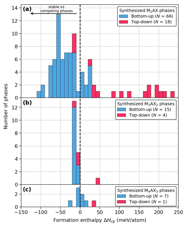 圖7 報道的三元MAX相的理論穩定性。計算了合成三元相的穩定性(見表1),顏色代表自下而上(藍色)或自上而下(紅色)的合成路線。箱子的尺寸是10 meV/atom。為了清晰起見,結果垂直偏移,其中211相在頂部,413相在底部,312相在中間。