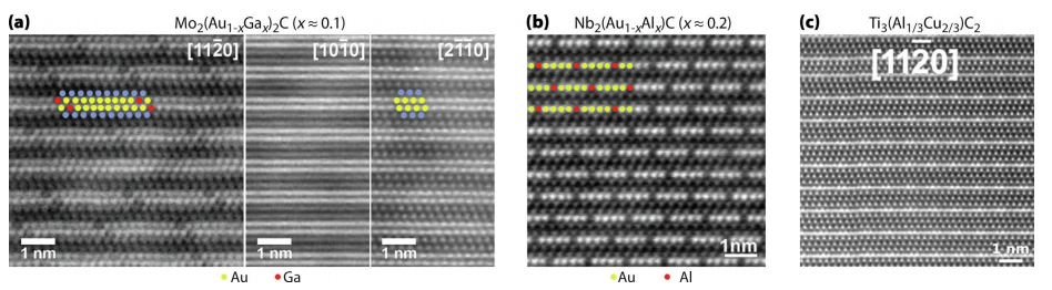 圖8 MAX相A層中觀察到的面內有序結構。高分辨率STEM圖像顯示了(a)Au和Ga在Mo2(Au1.Gax)2C中的面內有序結構,(b)Au和Al在Nb2(Au1.xAlx)C中的面內有序結構,以及(c)Al和Cu在Ti3(Al1/3Cu2/3)C2中的面內有序結構。為了清晰起見,A層中的一些金屬原子被高亮顯示,以便于與黃色的Au、紅色的Ga和Al進行比較。圖像取自參考文獻[78,83,86]。