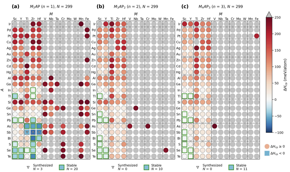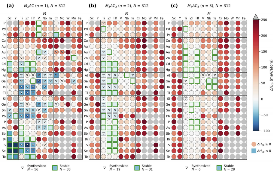 圖13 計算出的形成焓 ΔHcp 作為三元 M_n+1AX_n 相的形成能 ΔE_f 的函數,其中 (a) n = 1,(b) n = 2,以及 (c) n = 3。假設的 MAX 相由灰色圓圈表示,通過自下而上方法合成的 MAX 相由藍色方塊表示,通過自上而下方法合成的 MAX 相由紅色六邊形表示。綠色區域表示滿足 ΔHcp < 0(和 ΔE_f < 0)的熱力學穩定區域。