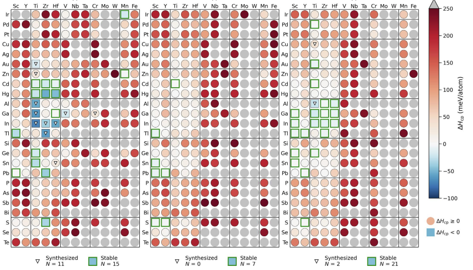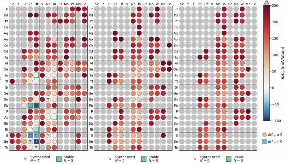圖10 計算了(a)211、(b)312和(c)413組合物中N基相的穩定性。三角形標記已經合成的MAX相,綠色方塊標記預測的穩定的MAX相(尚未合成)。藍色表示穩定的相(ΔHcp < 0),紅色表示相(0 ≤ ΔHcp <+250 meV/atom),灰色表示不穩定的組合物(ΔHcp > +250 meV/atom)。